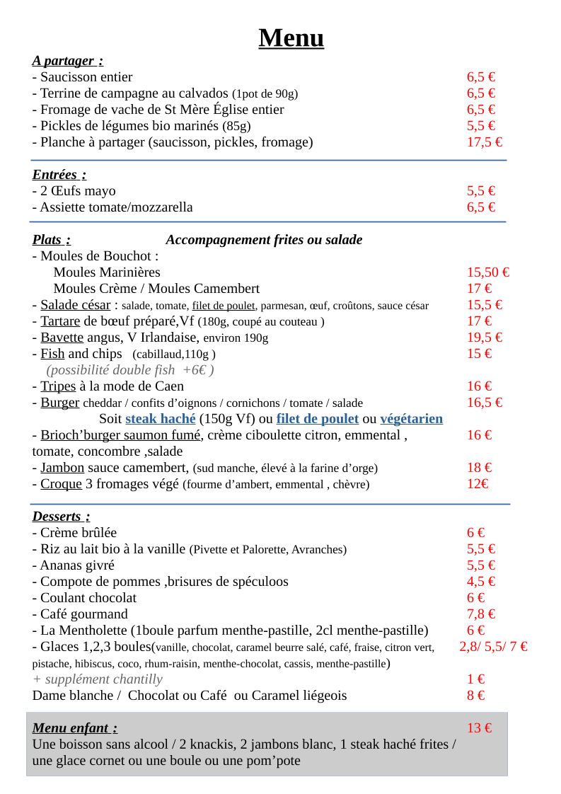 From a reviewer’s perspective, the summer menu at Le Grand Môme, located at 9 Av. des Sapins, 50610 Jullouville, France, feels like a confident celebration of approachable French brasserie classics, designed to please both locals and seaside visitors. The Menu de l’été 2022: Carte opens with a convivial spirit through its sharing plates, encouraging the table to linger over Saucisson entier, Terrine de campagne au calvados, Fromage de vache de St Mère Église entier, Pickles de légumes bio marinés, and a generous Planche à partager-all ideal for setting a relaxed, social tone. The starters remain simple yet comforting, with 2 Œufs mayo offering nostalgic charm and Assiette tomate/mozzarella providing a fresh, seasonal contrast. Main courses lean into hearty, well-loved flavors: seafood lovers can enjoy Moules Marinières, or opt for richer variations like Moules Crème and Moules Camembert, while classic brasserie dishes such as Salade césar, Tartare de bœuf préparé, Vf, Bavette angus, V Irlandaise, and V Irlandaise (Irish beef) reflect a focus on quality meat and straightforward preparation. Desserts round off the experience with familiar French comforts, from the crisp caramel top of Crème brûlée to the nostalgic warmth of Riz au lait bio à la vanille, the refreshing sweetness of Ananas givré, and indulgent finishes like Compote de pommes, brisures de spéculoos and Coulant chocolat. The inclusion of a dedicated Menu enfant also highlights the restaurant’s family-friendly approach. Overall, the menu at Le Grand Môme succeeds as a cohesive, well-balanced offering-rooted in tradition, generous in spirit, and perfectly suited for a relaxed summer meal by the Normandy coast.